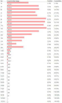 The following is a recent histogram of aggregated DNS resolutions times observed during tests of Google Chrome by Googlers, prior to the product's public release. The samples listed are only those that required network access (i.e., took more than 15 ms). The left column lists the lower range of each bucket. For example, the first bucket lists samples between 14 and 18ms inclusive. The next three columns show the number of samples in that range, the fraction of samples in the range, and the cumulative fraction of samples at or below that range. For example, in the first bucket, there were 31761 samples in this bucket range, or about 5.10% of all the 6,228,600 samples shown. Looking at the cumulative percentage column (far right), we can see that the median resolution took around 90ms (actually, 52.71% took less than 118ms, but 43.63% took less than 87ms). Reading from the top of the chart, the average DNS resolution time was 271ms, and the standard deviation was 1.130 seconds. The "long tail" may have included users that lost network connectivity, and eventually reconnected, producing extraordinarily long resolution times.