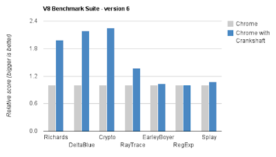 Today we are introducing Crankshaft, a new compilation infrastructure for V8, Google Chrome’s JavaScript engine. By using aggressive optimizations, Crankshaft dramatically improves the performance of compute-intensive JavaScript applications - often by more than a factor of two! This will give users a faster and more responsive experience loading web pages and applications built with complex JavaScript. Here is a comparison of Chrome with and without Crankshaft on the
